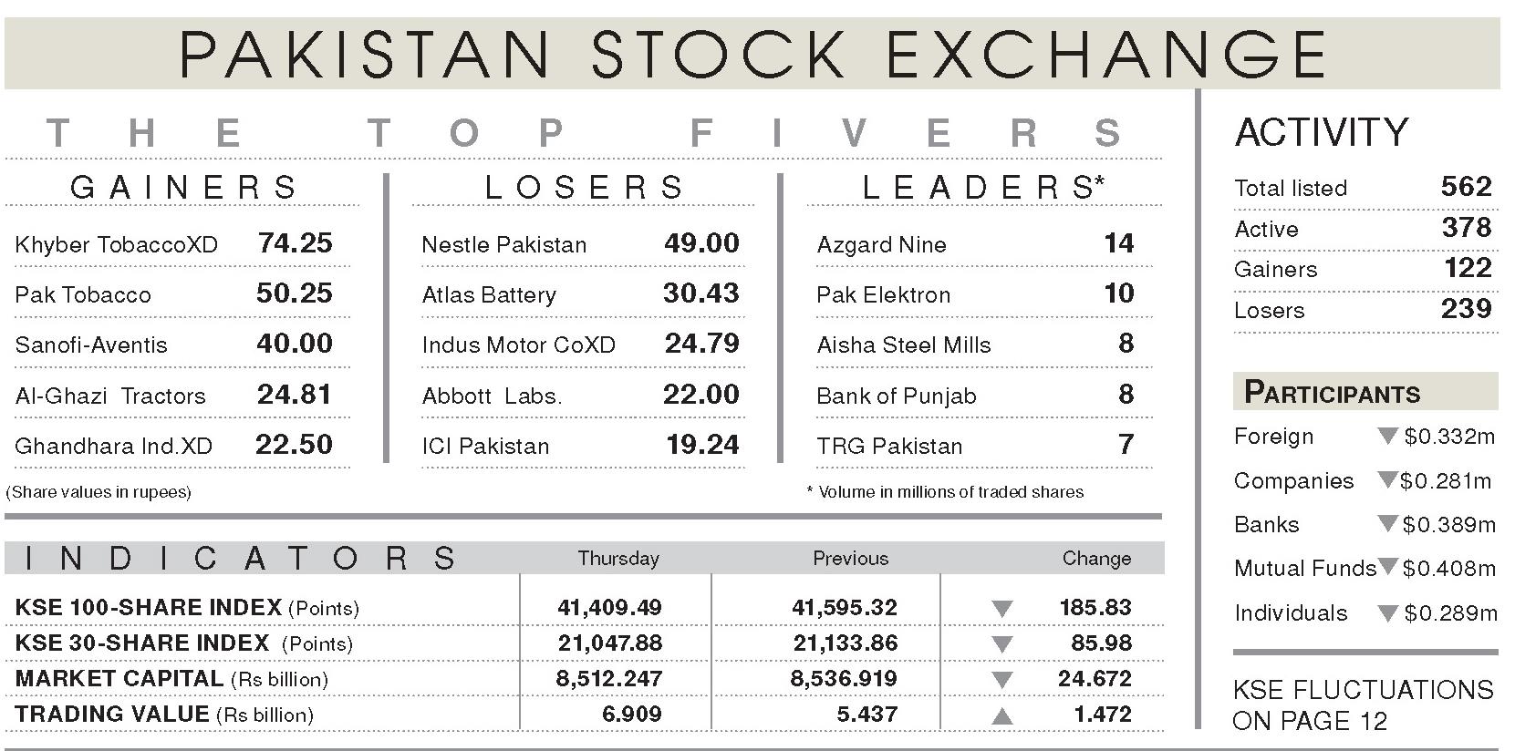KARACHI: Stocks declined in a range-bound, lacklustre trading session on Thursday where the KSE-100 index lost 186 points (0.45 per cent) to close at 41,409.